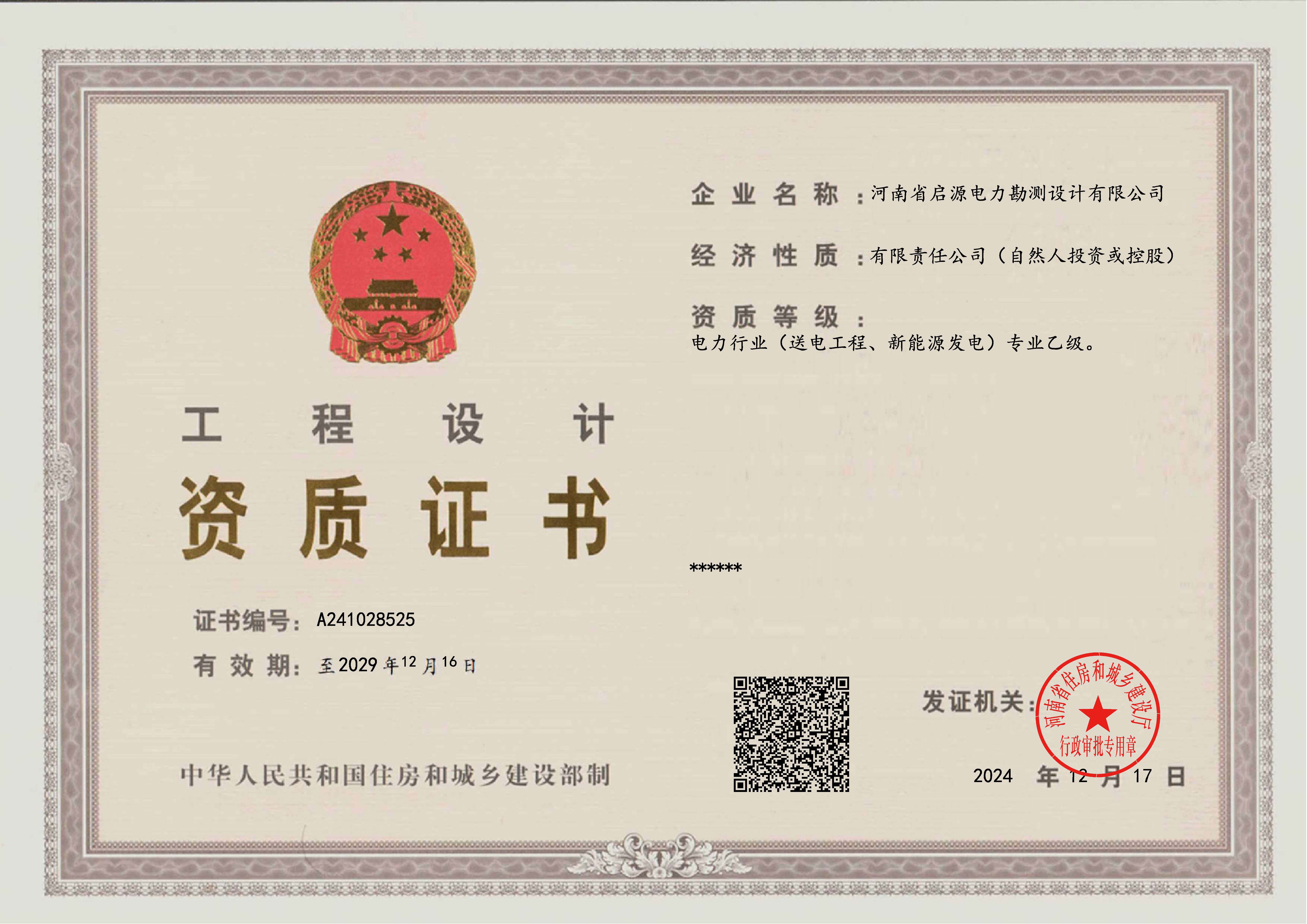 工程设计甲级资质证书