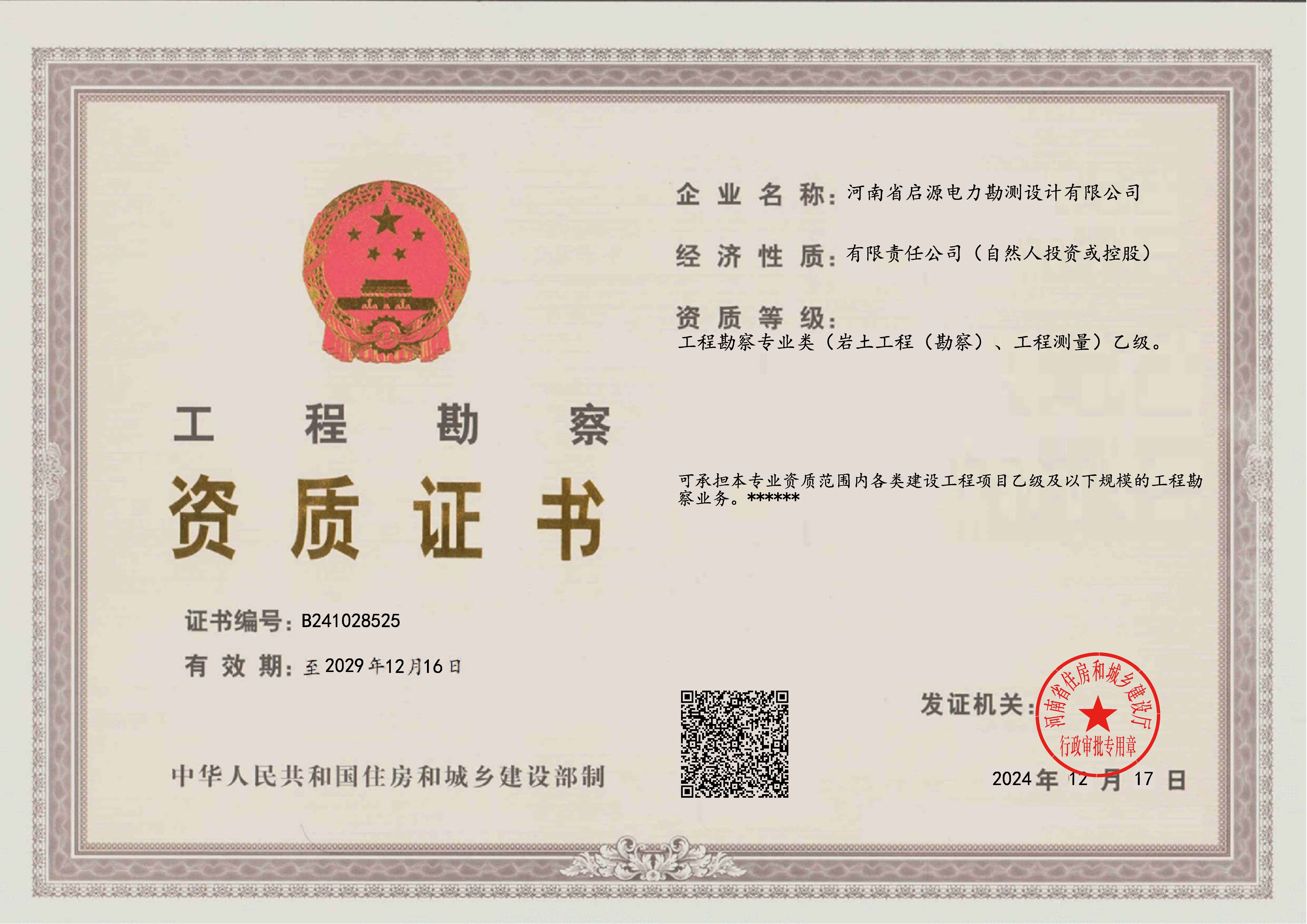 工程勘察乙级资质证书